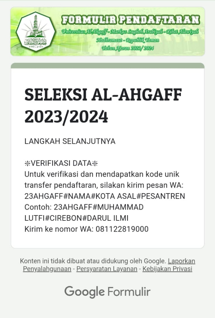 8. Nomor anda akan dimasukkan grup WA SELEKSI Al-AHGAFF 23 dan diarahkan untuk mengisi Formulir Kartu & Pilihan Fakultas & Jurusan