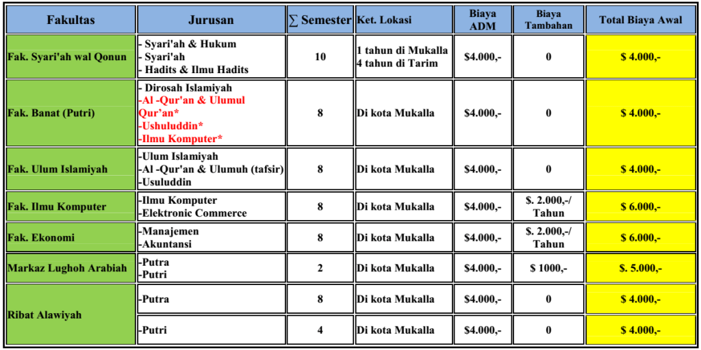 Adapun bagi yang belajar di Markaz Lughoh Arabiah dikenakan biaya tambahan $1000,- sehingga totalnya:$ 5.000,-