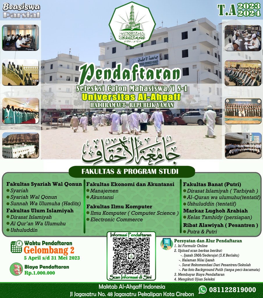 Dalam rangka menyiapkan generasi intelek Islam yang memiliki kemampuan akademik, motivasi yang tinggi terhadap ilmu agama Islam & profesional, melalui kantor Al-Ahgaff Indonesia, Universitas Al-Ahgaff merekrut pelajar dan mahasiswa dari indonesia, Malaysia, dan sekitarnya untuk menimba ilmu di bumi para wali, Hadhramaut – Republik Yaman.